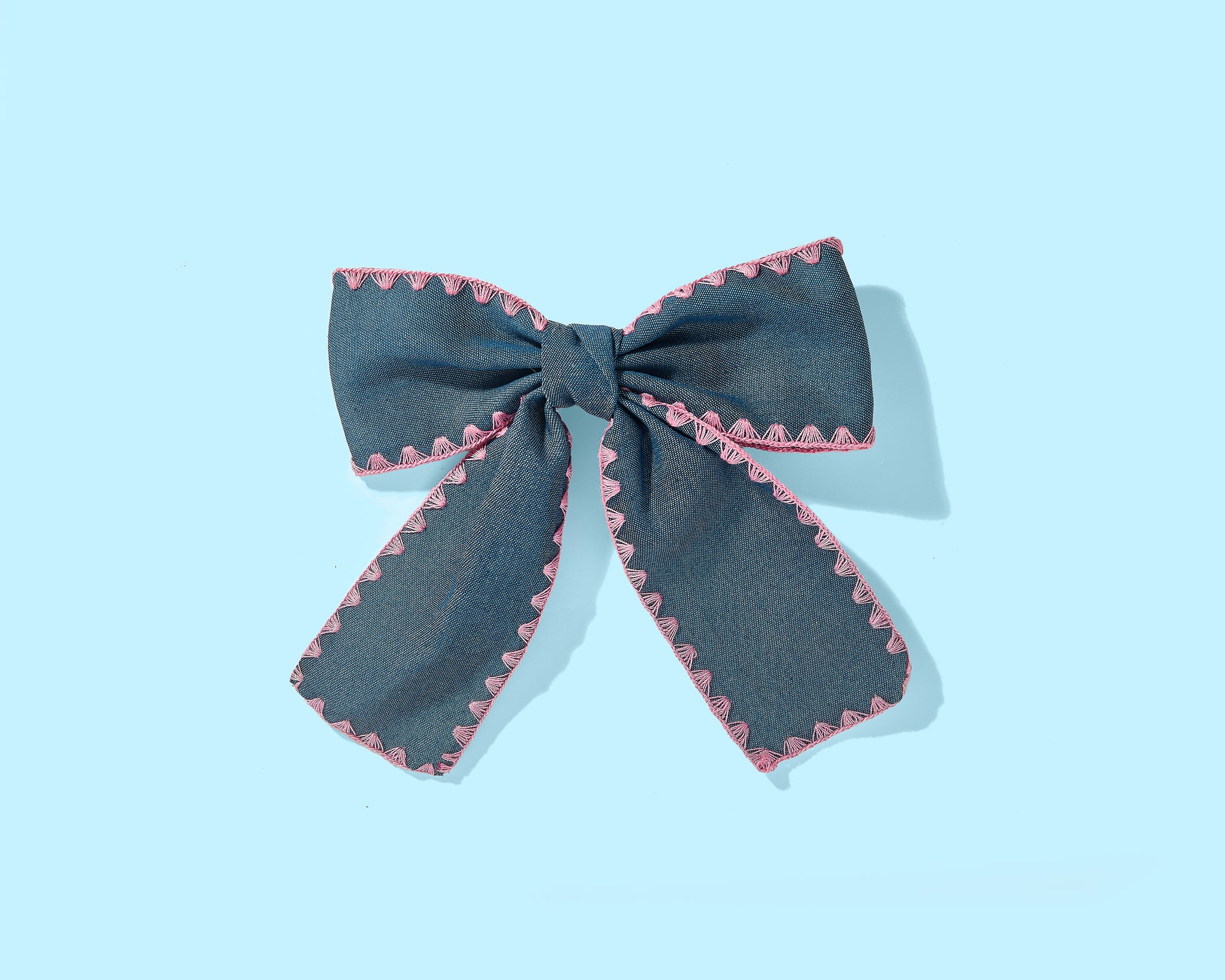 This dark chambray hair bow, edged with playful pink stitching, is perfect for girls who want a fun yet stylish accessory. Its rich color contrasts beautifully with the bright pink detail, adding a cheerful pop to any hairstyle.
