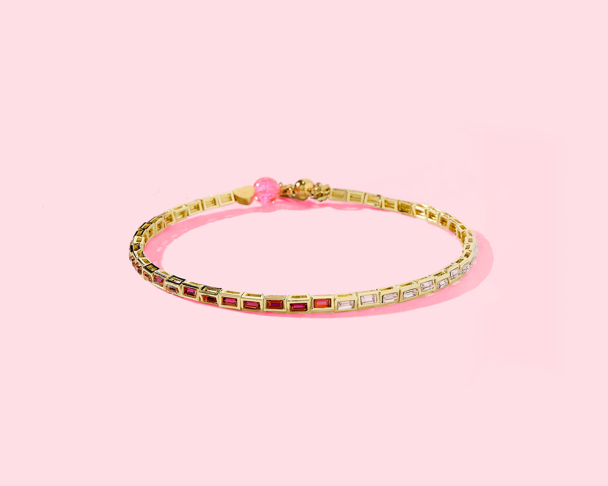 The Amore Baguette Necklace is a playful take on timeless elegance. This choker-style stunner features a color-block design: delicate light pink baguettes on one side transition to rich rose pink on the other, creating an eye-catching gradient effect. Perfect for adding a touch of sparkle to your everyday look or elevating your evening style.