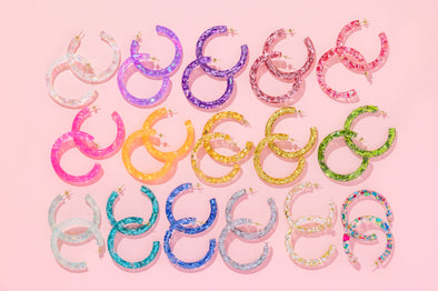 Liven up your store with our Confetti Hoop Earrings! With 16 different vibrant confetti colors, this collection is sure to turn heads. Great for gifting or adding a fun, fashionable touch!