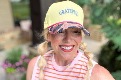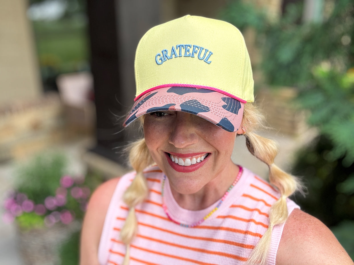 This playful Grateful Baseball Hat features a bright yellow crown, a trendy leopard print brim, and blue and pink accents. The cheerful embroidered "Grateful" adds a fun, positive touch, making it the perfect accessory to brighten up any casual outfit.