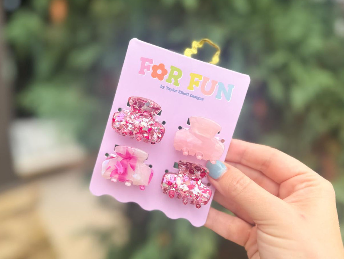 This set includes four mini claw clips designed specifically for tweens, featuring two pink confetti clips and two pink acetate acid clips. Perfect for adding a playful yet stylish touch to everyday hairstyles, these clips combine durability with trendy colors to keep hair secure and fashionable throughout the day.