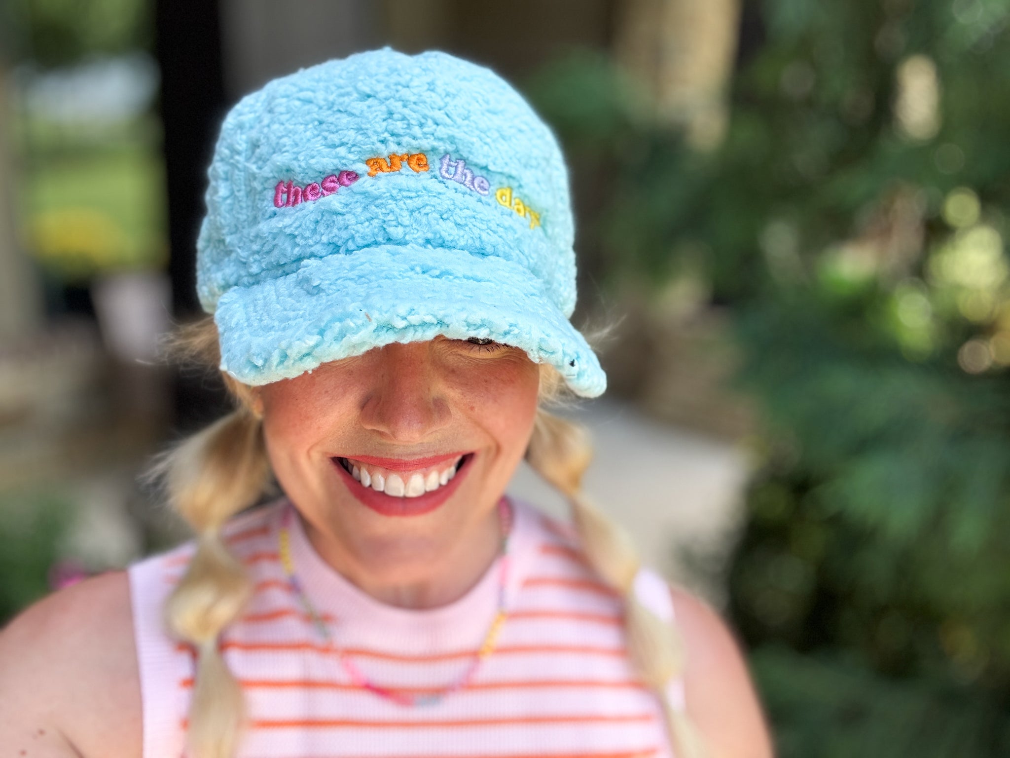 Embrace the cozy vibes of fall and winter with this playful blue sherpa baseball hat. Featuring embroidered text that reads "These Are the Days," it’s the perfect accessory to keep your customers warm while adding a cheerful touch to their seasonal outfits. Help them stay comfy and stylish all season long!